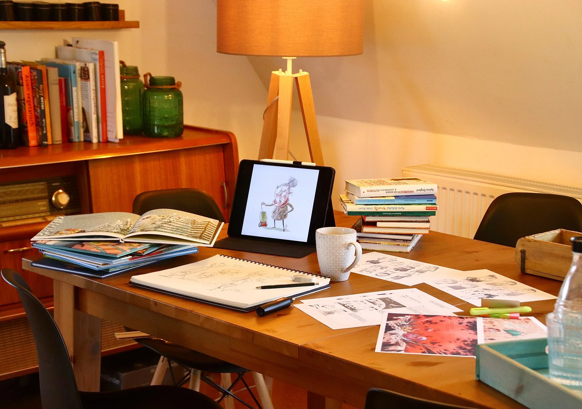 Ich hätte gerne ein großes Atelier mit viel Platz zum herumsauen. Und tatsächlich möchte ich auch wieder mehr analog machen. Das ist aber gerade nur ein Wunsch, denn außer ein paar Bleistiftzkizzen arbeite ich überwiegend digital am großen Zeichenbildschirm. Aber je mehr die Technik ins Leben rückt, desto mehr wächst in mir auch der Wunsch, wieder mehr analog auszuprobieren. Ein weiterer Punkt ist, dass einem einfach die Original fehlen.